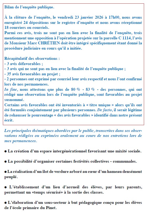 Le nombre d’avis favorables exprimés sur ce projet de jardin public - et plus largement sur les aménagements prévus ces prochaines années au Pinet - par des habitants aux profils variés — riverains, parents, grands-parents ou encore résidents d’autres hameaux - rejoignent les enseignements issus de la concertation préalable. Cette diversité de points de vue conforte la commune dans la pertinence de ce projet, qui répond à des besoins aujourd’hui insuffisamment couverts et participe pleinement à l’amélioration du cadre de vie et de la dynamique villageoise.