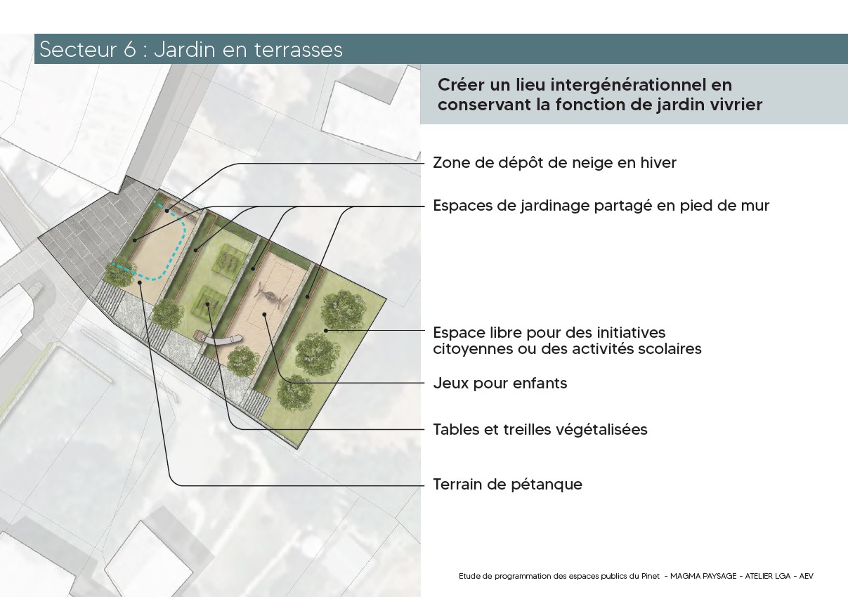 Le projet prévoit la création d’un jardin public convivial et intergénérationnel, au cœur du hameau du Pinet, à proximité immédiate de l’école.