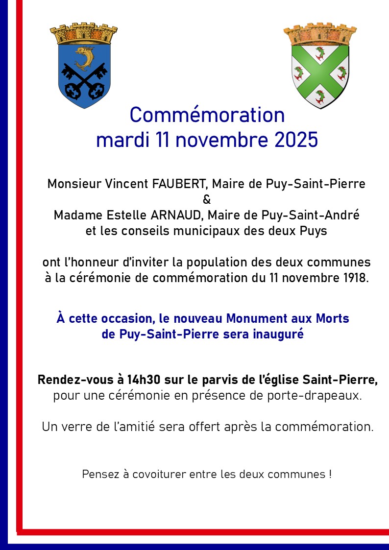 Les communes de Puy-Saint-Pierre et Puy-Saint-André commémorent ensemble, pour la cinquième année, l’Armistice du 11 novembre 1918