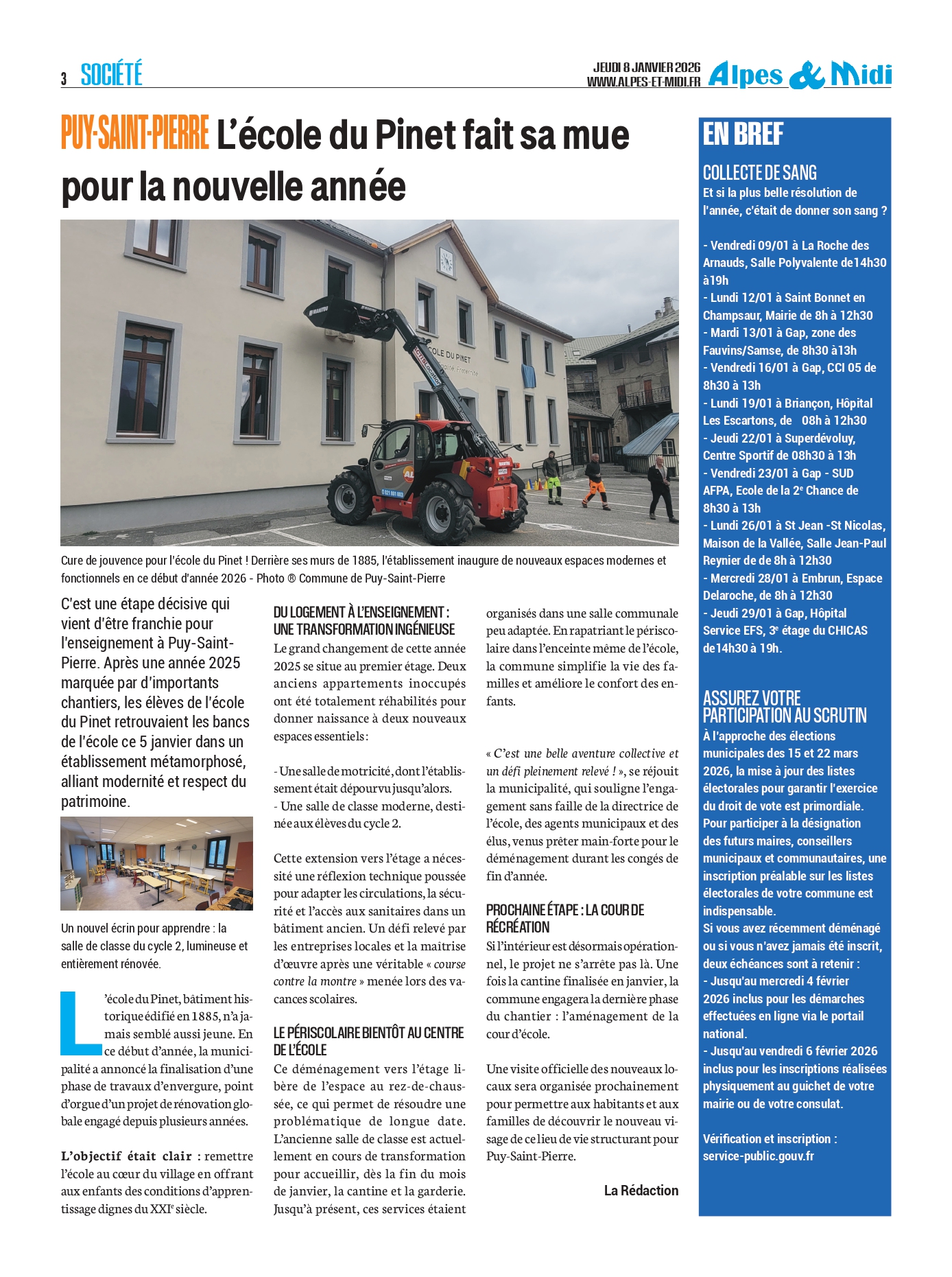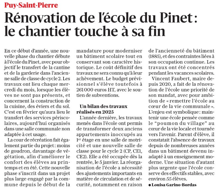 Dans le prolongement des travaux de rénovation énergétique engagés ces dernières années, la commune de Puy-Saint-Pierre a conduit en 2025 une nouvelle phase de travaux d’ampleur à l’intérieur de l’école du Pinet. Avec cette étape décisive, l’établissement aura été entièrement rénové au cours du mandat municipal.