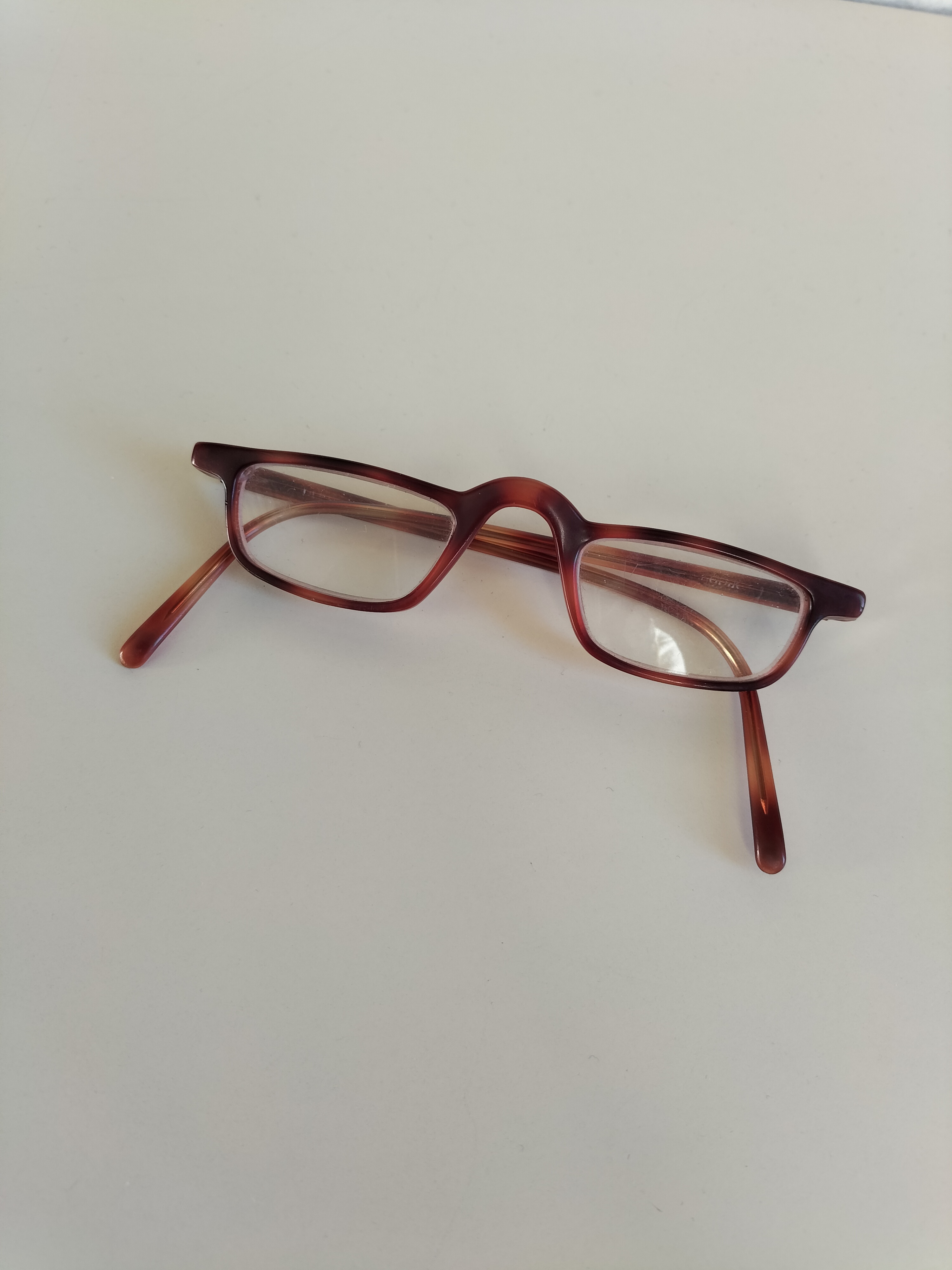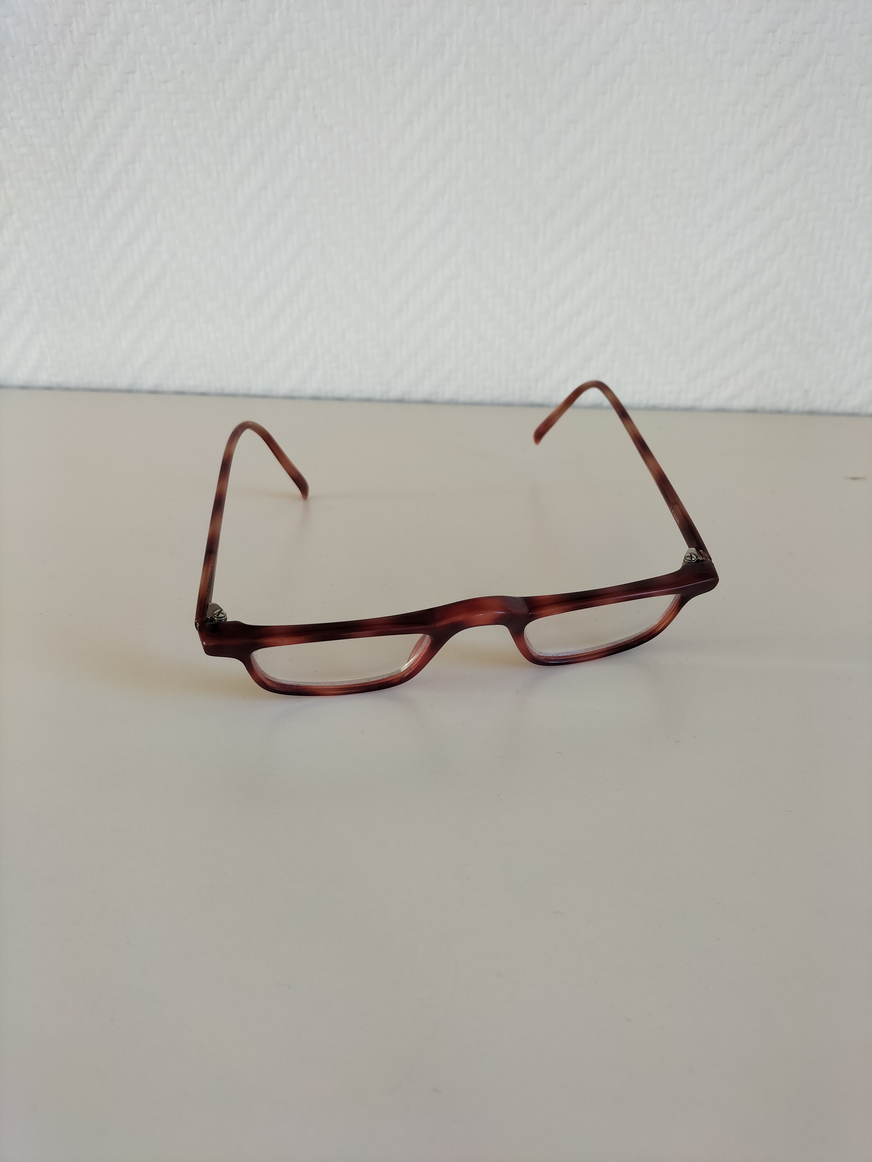 Une paire de lunettes de vue, monture plastique couleur cuivre.