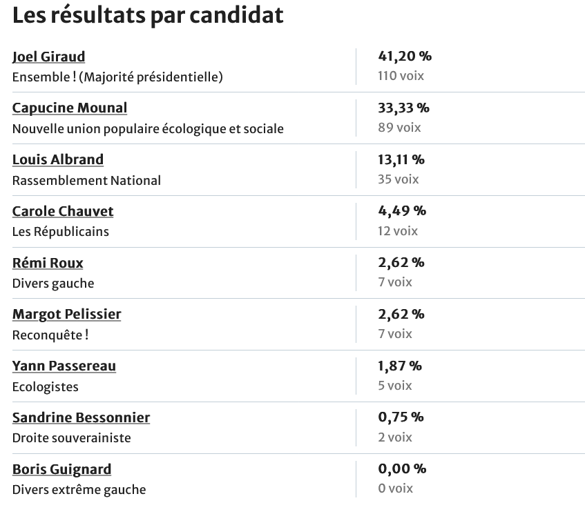 Carole CHAUVET (LR, 4,49 % des votes exprimés), Rémi ROUX (DVG, 2,62 %), à égalité avec Margot PELISSIER (Reconquête !), et Yann PASSEREAU (ECO, 1,87 %) obtiennent un score moindre dans la ville.